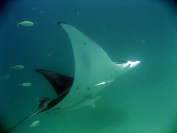 hat und mit der Unterseite nach oben um uns rumgeschwommen ist. Mantas haben die