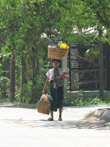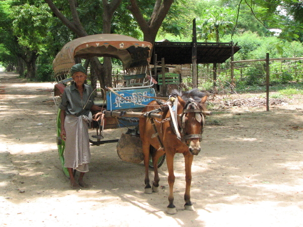 ... ist die Pferdekutsche. Inwa, eine alte verfallene Kaiserstadt ausserhalb Mandalays, liegt auf einer kleinen Insel, die nur von Pferdekutschen befahren wird. Diese fahren einen in ca. 3 Stunden einmal rund um die Insel, vorbei an allen Sehenswürdigkeiten. An sich eine schöne Sache, wenn man nicht genau an ein super-fieses Pony gerät, das versucht, einem die Hand abzubeissen. Die bösen Bissspuren sind auch nach einem Monat noch sichtbar ;-(