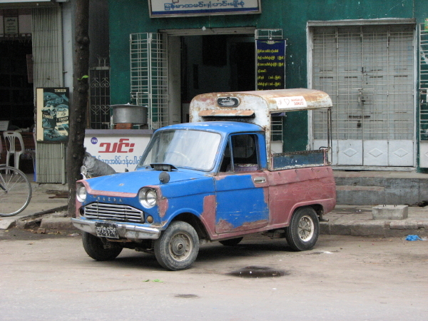In Mandalay gibt es motorisierte Taxis (was ja in Myanmar nicht oft der Fall ist ;-) Die meisten sehen in etwa aus, wie auf dem Bild. Wir haben für zwei Tage ein solches mit Fahrer gemietet (allerdings in einem etwas besseren Zustand), und sind damit auf Entdeckungstour gegangen.