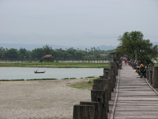 Etwas ausserhalb Mandalays liegt die antike Stadt Amarapura. Dort gibt es mit der U-Bei-Brücke die längste Teak-Holz-Brücke der Welt. An einigen Stellen fehlen Bohlen, auf manchen Abschnitten das Geländer, aber auf der Brücke herrscht reger Betrieb. So richtig super-sehenswert war das jetzt auch nicht, aber es ist schön, einfach auf der Brücke zu sitzen, die Füße baumeln zu lassen und den Fischern zuzusehen ...