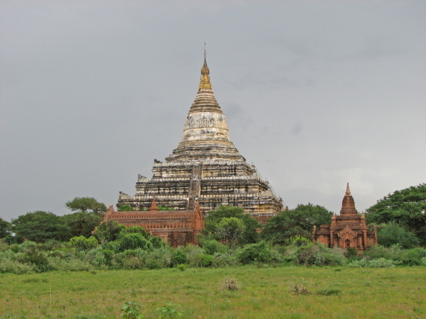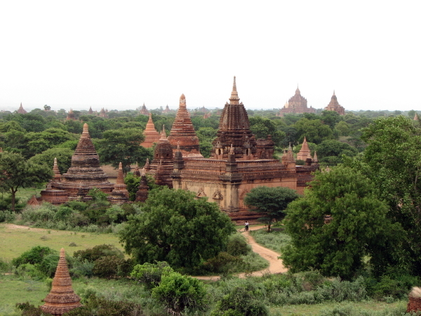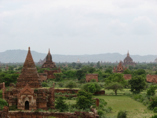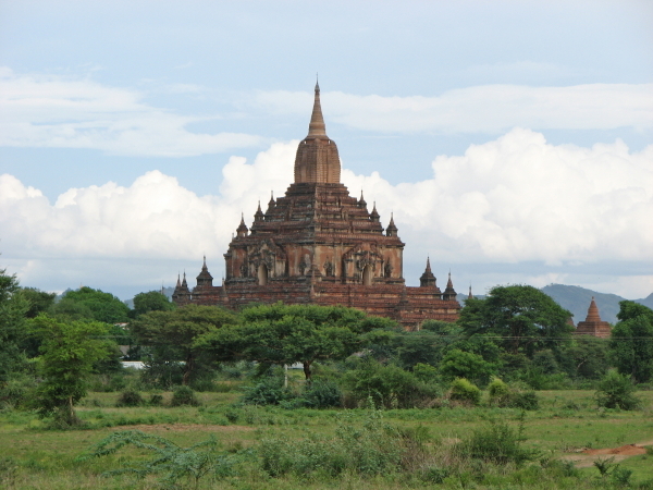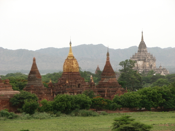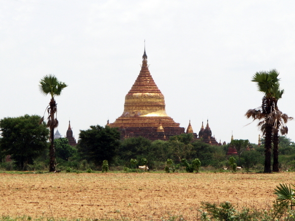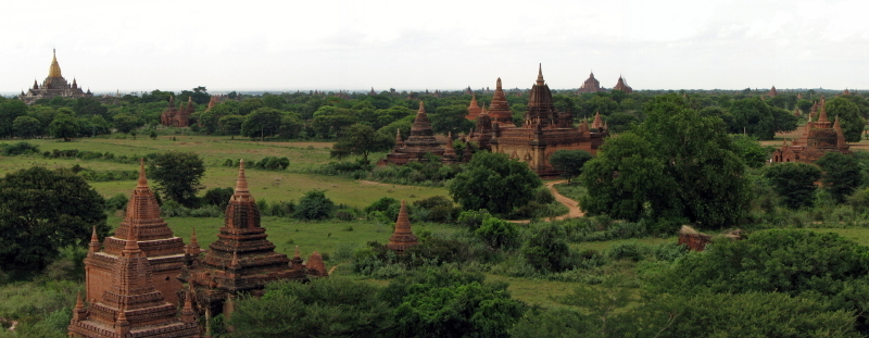 Lässt man den Blick weit schweifen, so sieht man, welche Fülle an Pagoden und Bauten sich quer über das Areal von Bagan erstrecken. Man kann gar nicht sagen, in welche Richtung die Aussicht am beeindruckensten ist. Hier kann am in der Ferne die goldene Pagode der Dhammayazika sehen, die fast von überall aus zu erkennen ist und einem immer eine gewisse Orientierung ermöglicht.
