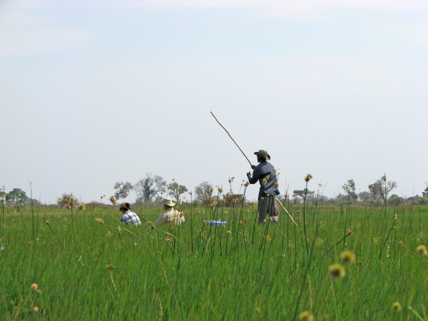 Die Leute, die am Ufer des Okawango-Deltas leben, haben eine sehr geschickte Methode, Fische zu fangen. Sie bauen an den Stellen, wo die Fische regelmäßig vorbeischwimmen, enge Holzzäune auf. Die Fische schwimmen diese entlang, um einen Umweg zu finden, landen jedoch in einer Art Labyrinth, aus dem sie nicht mehr herauskommen. Die Fische leben weiter, bleiben frisch und bei Bedarf kommen die Leute und holen sie. Und obwohl sie bis zur Taille im Wasser stehen sind die Leute komplett angezogen. Und das sogar recht schick.